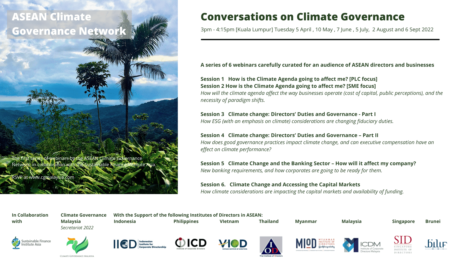 Following on from the landmark launch of the ASEAN Climate Governance Network, and in collaboration with the Sustainable Finance Institute Asia, we are pleased to announce “Conversations on Climate Governance”, a series of 6 curated webinars focusing on spurring conversation on climate risk and the need to address it from a business perspective.