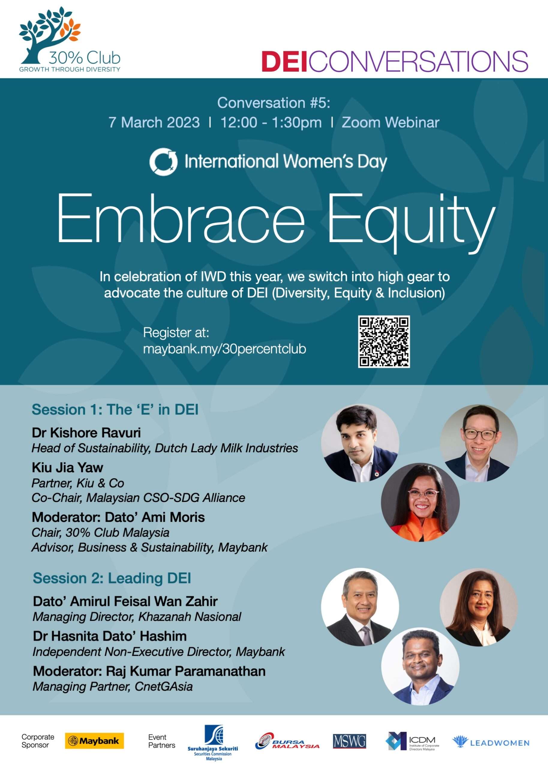 As an advocate of Diversity, Equity & Inclusion, we are pleased to inform you that the 30% Club will be organising its DEI Conversation #5: Embrace Equity, in celebration of International Women’s Day. The 30% Club is a global business campaign to advocate for more gender parity in boardrooms.