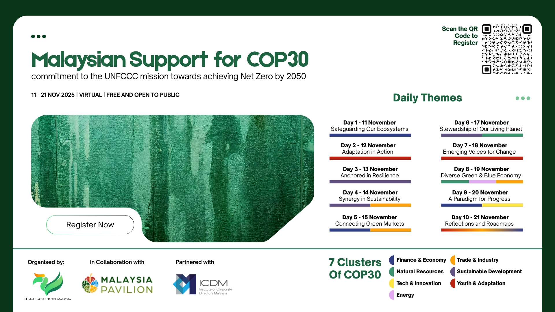 Building on its participation in the COP29 Parallel Program, Climate Governance Malaysia is organising the Malaysian Support for COP30 Parallel Program from 11 to 21 November 2025.