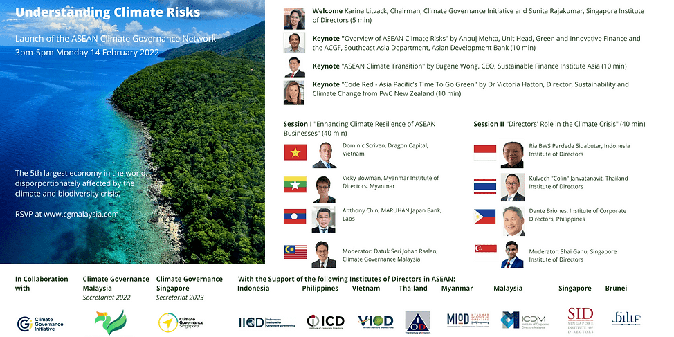 After many discussions, with the staunch support of the Institute of Corporate Directors Malaysia, Climate Governance Malaysia (CGM) are launching the ASEAN Climate Governance Network on Monday 14 February 2022, our Valentine to the Earth.