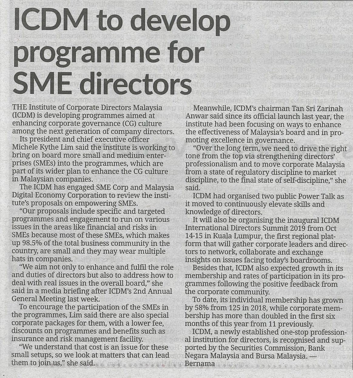 Its president and chief executive officer Michele Kythe Lim said the institute is working to bring on board more small and medium enterprises (SMEs) into the programmes, which are part of its wider plan to enhance the CG culture in Malaysian companies.